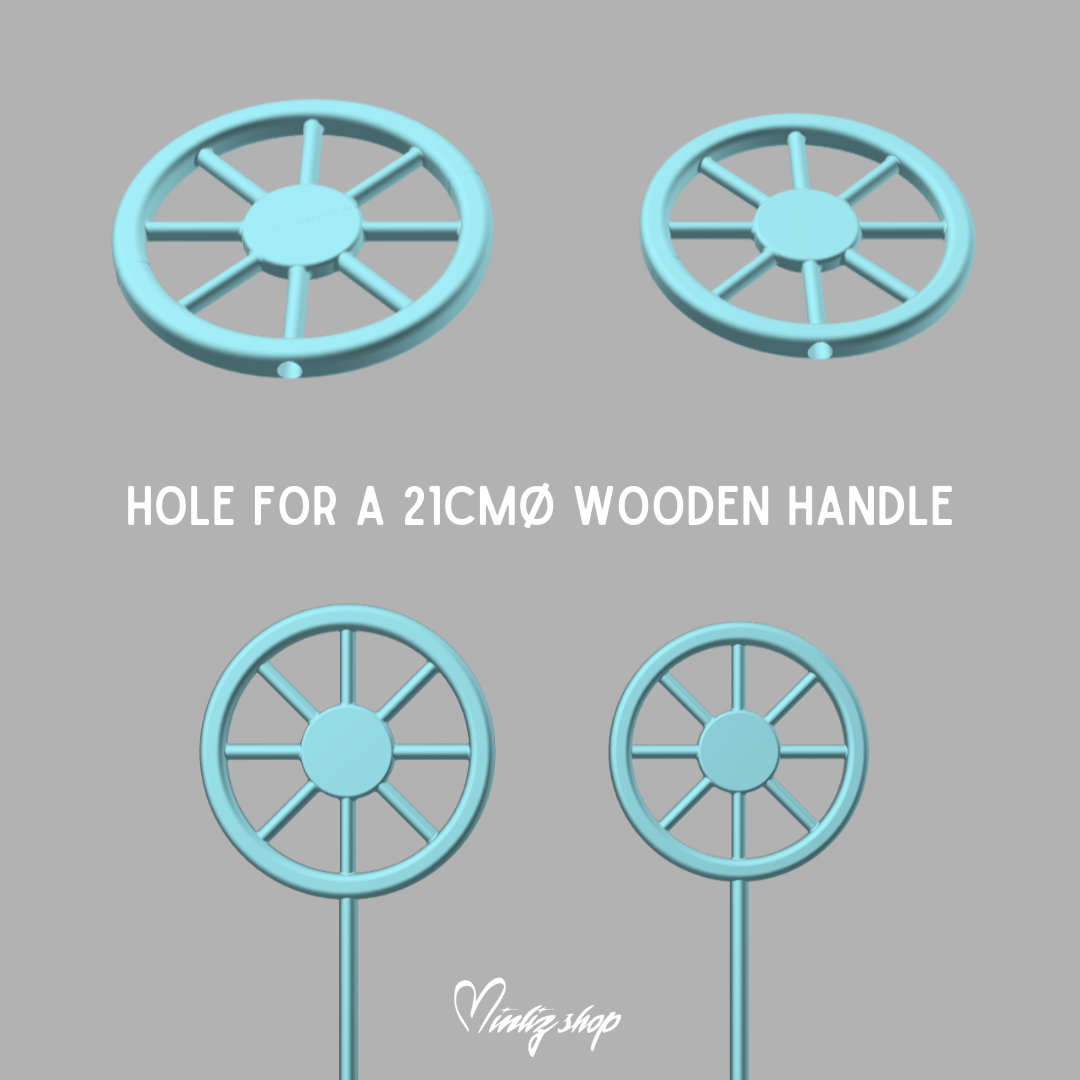 Handle and wooden stick are not included in the 3d model. You will need a 21mm diameter Wooden pipe for the handle as well as 10mm diameter wooden sticks and epoxy glue/super glue to connect the pieces together.